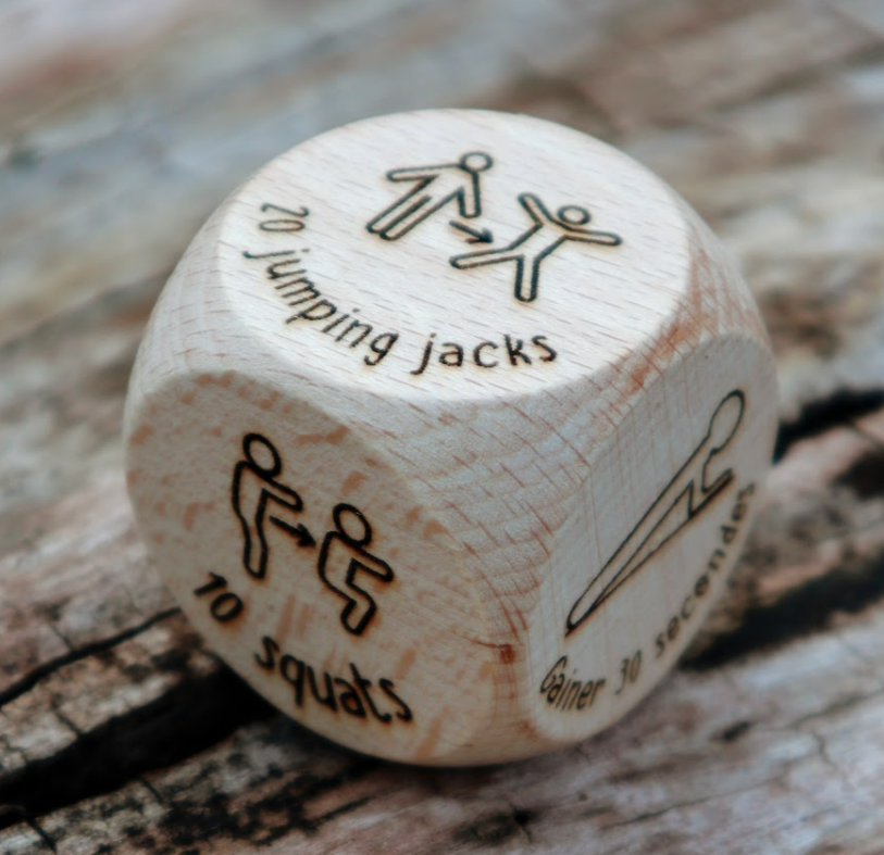 Works great for group workouts, where each player takes turns rolling the die and performing the activity. The first who is unable to complete the exercise loses.